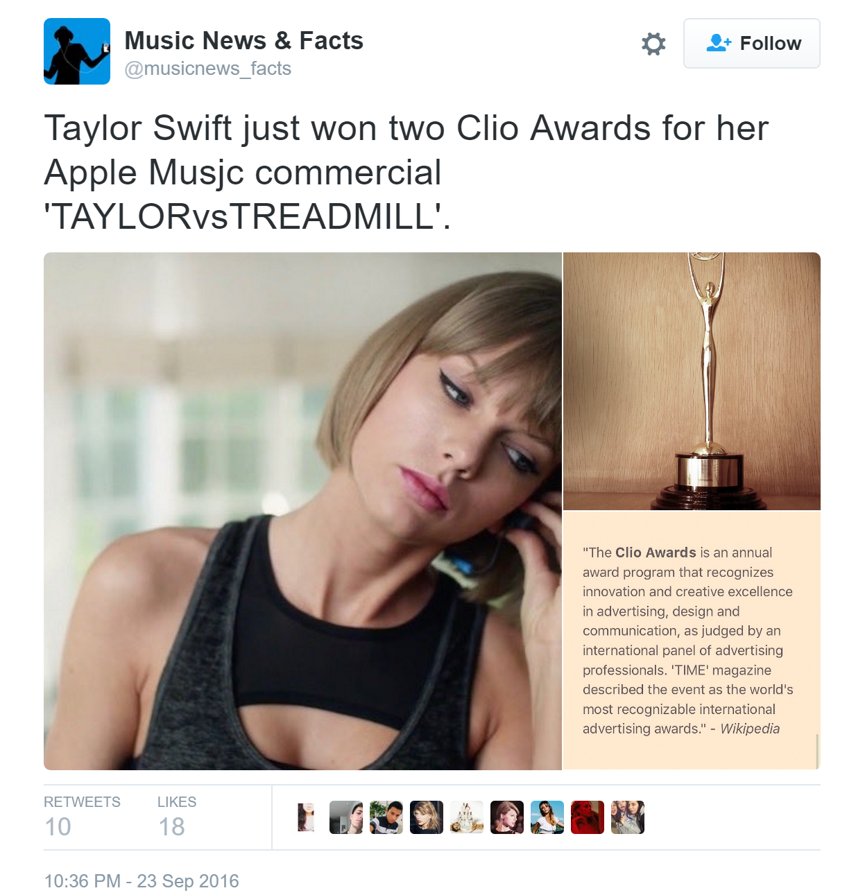 Совсем недавно стали известны победители ежегодной премии "Clio Awards". Среди награжденных оказалась и Тейлор, получившая сразу 2 статуэтки за видеорекламу для компании "Apple Music". Поздравляем!